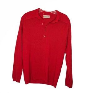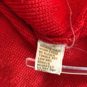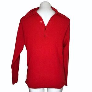 True red sweater, it came to the US from Canada with my family in the 70s. About 1/3 front button closure with collar. No size tag that I can find. Base Fit On measurements. 20” underarm to underarm, 17” across hem, 26” long. No fabric tag, probably polyester, machine wash. Some general fuzziness/ pilling. No holes or major stains. This belonged to my father but can certainly be considered Unisex.