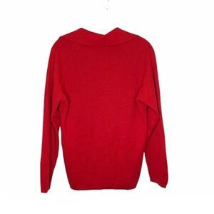 True red sweater, it came to the US from Canada with my family in the 70s. About 1/3 front button closure with collar. No size tag that I can find. I have listed it as a medium based on fit and measurements.