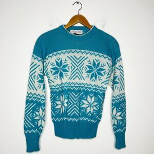 VTG long sleeved knit sweater in a bright colorful blue and white winter snowflake pattern. Ribbed at neckline, cuffs, and hemline with a thin white stripe.
