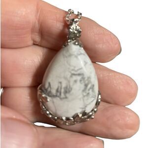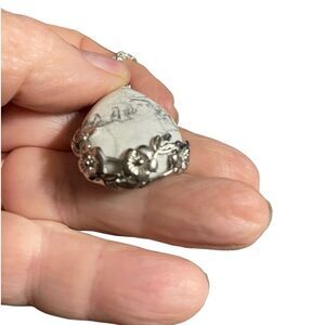 Silver floral design at top of bezel, around the bottom of the stone and the back
