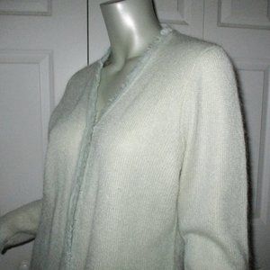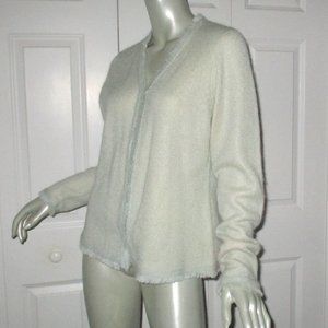 White + Warren mohair blend cardigan sweater in a lovely shade of palest celery green. Contrasting full lining in ivory. It features frayed details, and a hook-and-eye front. Excellent condition - worn only a couple of times. Dry clean only.