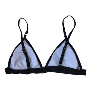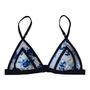 White and Blue Floral Bikini Top with Black Trim and Adjustable Straps - Size Medium. No visible flaws. Excellent pre-owned condition. LIKE NEW!