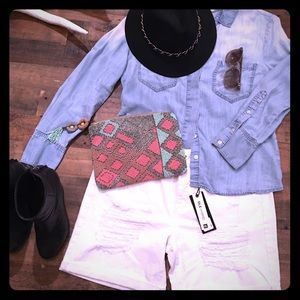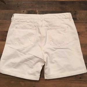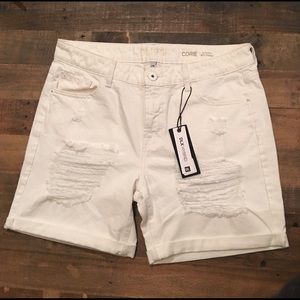 Distressed white denim shorts. Boyfriend style! Holes/tears in front. Cuffed finish. Brand new - never worn.