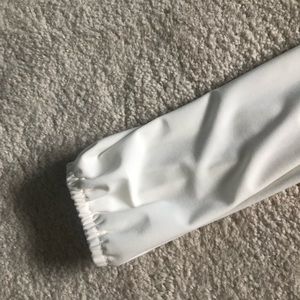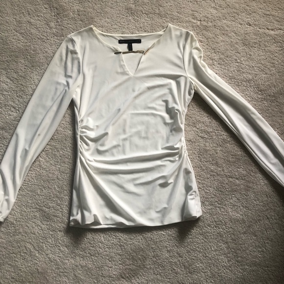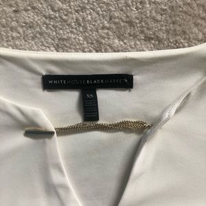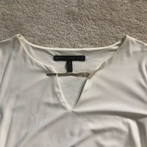 White blouse with gold metal collar detail. Elastic sleeve and gathered waist detail. Super flattering. Lightly used but still in great condition.