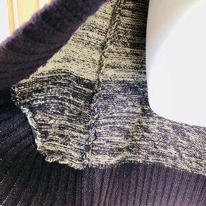 Wide ribbing around collar, placket and around the bottom to the back, as well as at cuffs. Rounded bottom.