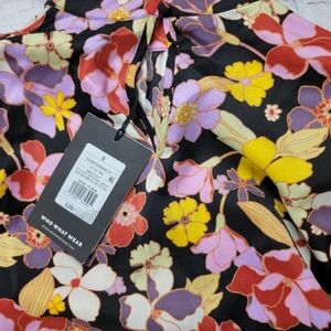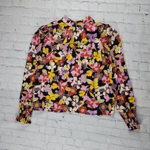 WHO WHAT WEAR Bohemian Garden floral top, high pleated collar, long sleeves, 2 button rear closure, elasticized cuffs, polyester, NWT, never worn/used