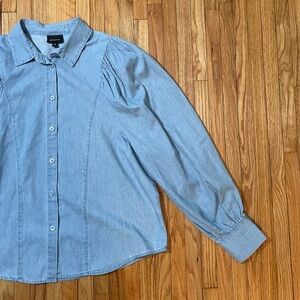 WHO WHAT WEAR Brand. Chambray Button-up with Balloon Sleeves. Size Medium. 100% Cotton. Actual Measurements: shoulder to shoulder 12 1/2”, pit to pit 19”, length 24”, & arm length 25”.