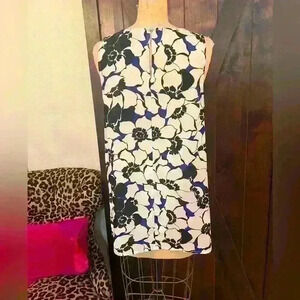 Sleeveless tunic with large floral print Black/White and a splash of Blue. Side slits. 1 Button and slit back closure.