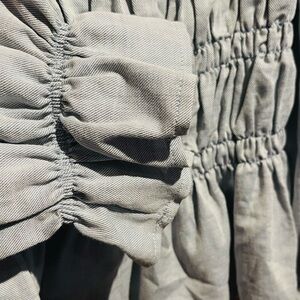 Elevate your wardrobe with this chic Who What Wear blouse featuring charming ruffle accents and puff sleeves. The chambray fabric and solid pattern give off a western, bohemian, and peasant vibe, making it a versatile addition to your collection. This cropped top has an off-shoulder design and is available in size XS, perfect for any fashion-forward woman. Pair it with your favorite high-waisted jeans or skirt for a retro look.