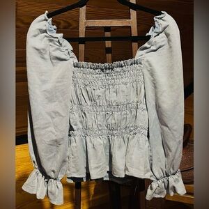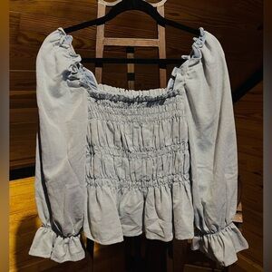 WHO WHAT WEAR Smock Blue Chambray Crop Peasant Puff Sleeve Off the Shoulder