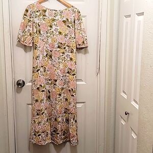 WHO WHAT WEAR WOMEN'S FLOWERS PRINT LINEN RAYON DRESS SHORT SLEEVE SZ L