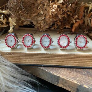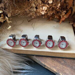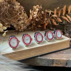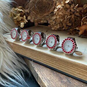 (WHOLESALE) 5 - Red Rhinestone Quartz Stretch Adjustable Silver Tone Watch Ring