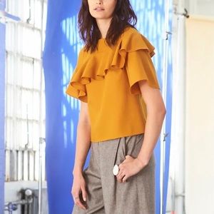 Super cute ruffled asymmetrical top in a marigold/ mustard color by WHiT by Whitney Pozgay. Indie label carried ad Garmentory. Made of 100% wool, and has an invisible zip and lining. Size P, fits a women’s XS. Approx measurements: pit to pit 17”, length 19”