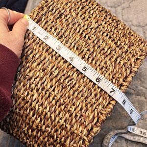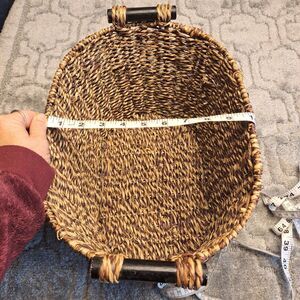 WICKER BASKET WITH WOODEN HANDLES MEDIUM TAN BROWN WOVEN OVAL WOODEN BOHO DECOR, LOVE THIS BASKET FOR MYSELF, BUT I HAVE TOO MANY AS IS,10x14.5x7.5 INCHES, GENTLY USED AND WELL LOVED, SEE ALL PICS FOR DETAILS, EUC.