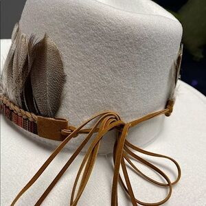 “Saddle Up” in this wide brim Panama style caramel color hat. Accent feather decor band.