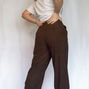 Try styling these adorable high-rise chocolate trousers with a peachy pink top and cream shoes.