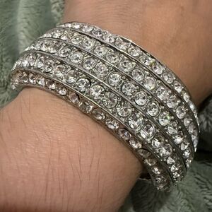 Prepare to shine like never before! This bold silver-tone hinged cuff bracelet is packed with rows of brilliant rhinestones that catch the light from every angle. Whether you’re dressing up for a night out or just want to elevate your everyday style, this piece brings major glam energy.