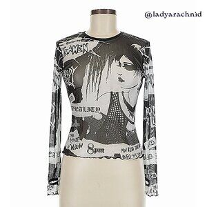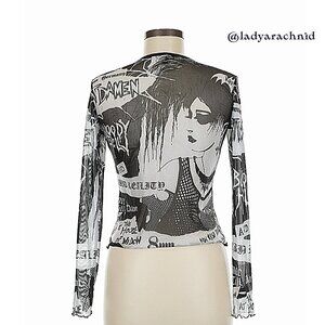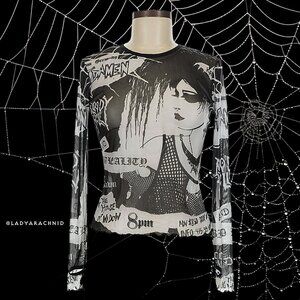 Express your inner punk with this old school Dolls Kill/Widow mesh long sleeve top! Features a lettuce edge hem, sheer mesh constructions, and thumbholes. Excellent preowned condition with no snags, stains, or holes. Measures about 16" pit to pit, 20" shoulder to hem, and 22" shoulder to wrist. Fabric has a good amount of stretch. Sold out long ago and not easy to find! Polite offers welcome. Smoke free home but we do have pets. BIN22
