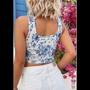 This WILA crop top showcases a striking blue and white floral pattern, offering a fresh and summery vibe. The sleeveless design with a fitted silhouette and thick shoulder straps ensures a comfortable and stylish fit. Ideal for pairing with various bottoms, this top is perfect for a chic summer look.