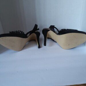 Black satin with rhinestones criss cross ankle strap. 5"heel 3/4"platform size 7.