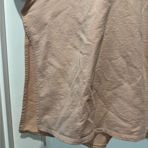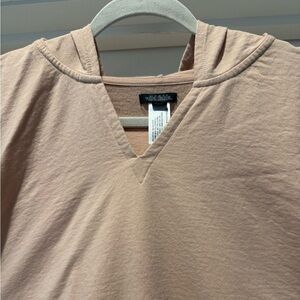 Relaxed fit hooded top in a soft tan color with pink under tones kind of peachy. Such a unique shirt slits on each side little v cut out at neck with a good. Perfect for casual wear, pair with jeans, shorts, sweats, joggers. Perfect to cozy up on the couch or wear out and about. Ath leisure, athletic, casual, cozy, comfortable!