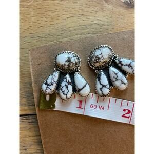 These stunning Wild Horse cluster earrings feature a rich mix of white and deep brown matrix stones — a beautiful combination of magnesite and hematite known for its natural desert marbling. Each stone is set in sterling silver with classic Navajo-inspired rope and serrated bezel details, giving them a bold, traditional Southwestern look.