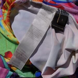 Slinky stretchy 88% polyamide 12% elastane blend, super bright kaleidoscopic print, body clinging wrap top, constructed to sit at hips not high waisted, slim slouchy leg, RC monogrammed decorative gold toned buttons, made in Italy