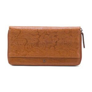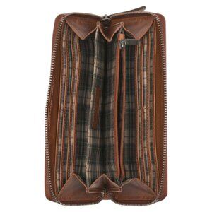 1 front slip pocket, interior accordion pocket, interior card slots, 2 interior currency pockets, 1 interior zip pocket