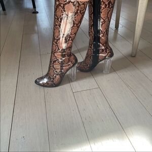 WILD DIVA SNAKE MOTIF PVC BOOTS. NEW. SIZE IS 6.5-7. VERY NICE LOOKING PVC BOOTS. HEEL HEIGHT IS 4 INCHES. HEEL IS NICE AND THICK FOR A CHIC LOOK.