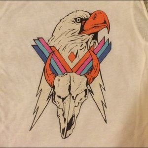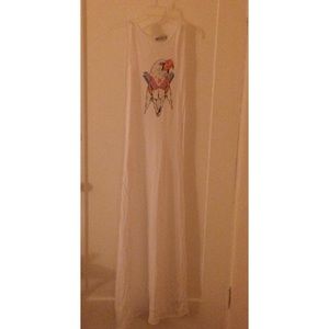 This crew-neck jersey tank dress features an eagle and skull graphic. Sleeveless and semi sheer & flowy. Great for a swimsuit cover up or over a long tank, or by itself if you're feeling "free"  The maxi is extra long as it is meant to be cut to fit any height, worn with a belt, or tied At the bottom.  Size XS but can fit up to Medium. Worn once - last pic is how I styled it!