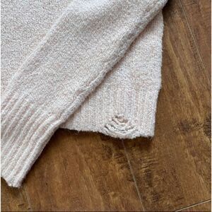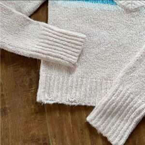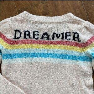 SUPER COOL AND ON TREND KNIT WILDFOX SWEATER WITH DISTRESSING/RIPPED HOLES ON BOTTOM HEM AND SLEEVES, V NECK, STRIPED DETAILS AND "DREAMER" PRINT. VERY LIGHT PINK/KIND OF BEIGE IN COLOR - SO CUTE!