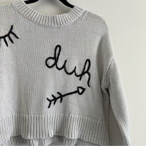 Women's slightly oversized jumper from Wildfox with cotton-blend, knit construction. Cutting a slightly cropped fit, the sweater features an oversized scoop neck with ribbed detail, and a pair of long sleeves with dropped shoulder seams for a slouchy aesthetic. Complete with contrast stitched motifs to the front and both sleeves. Ribbed cuffs and hem