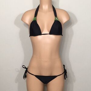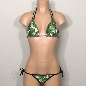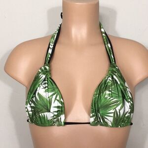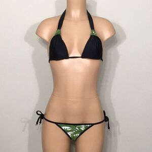 Beautiful fern patterned triangle bikini set. I love the sliding triangle top. You can pull down the knot on the top to make it smaller or larger. Ties at the neck and back. Gold medallion embellishment. Reverses to black. Bottoms are Brazilian cut with side ties. Reverse to black. Very sexy!