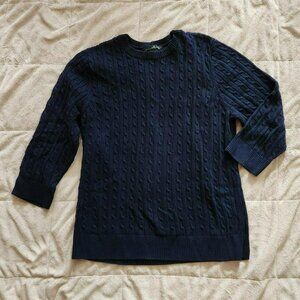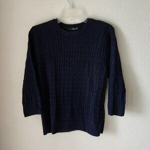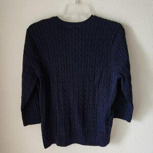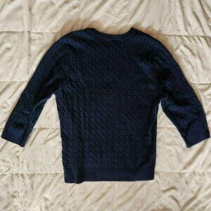 Classic dark navy blue cable knit sweater. 3/4 length sleeves. Preppy, collegiate, ivy league, quiet luxury, coastal vibes. Nice 100% Cotton materials, very comfortable quality sweater.