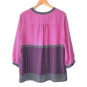 Casual, bright, 3/4 sleeve, semi-sheer blouse made by Willi Smith in size X-Large. Vibrant pink and dark blue geometric pattern with black and white accents. Split V-neck. Sleeves are loose fitting with a slight balloon style, and each have 1 button. Pintuck detail on the upper back adds light pleats (picture 7). 100% Polyester is lightweight and breathable. Flowy fit pairs with most bottoms from jeans to trousers. This fun top is perfect for casual outings or a day at the office. In EUC with no holes, snags, or stains. Bundle with other items for the best deal!
