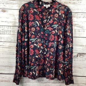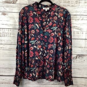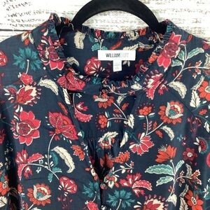 William Rast Brand, Size XXL , Floral print blouse, buttons down, long sleeves, navy blue color with red flowers, fall blouse, excellent pre owned condition. Approximately measurements: Ptp 23" Length 28 ".
