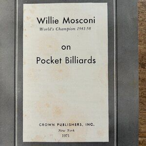 Vintage paperback edition of MOSCONI ON POCKET BILLIARDS, from the "Little Sports Library," copyright 1948, 1959, published by Crown Publishers. Willie Mosconi was the World Champion in pocket billiards from 1941 to 1958. This 143-page book on pocket billiards "attempts to cover all phases of the game," from fundamentals to championship play. Aimed at both beginners and more advanced players; helpful black-and-white photos and diagrams throughout show techniques of the game.