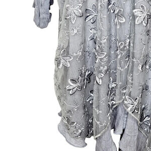 Front has two mesh panels of embroidered flowers that hang down to the uneven hemline