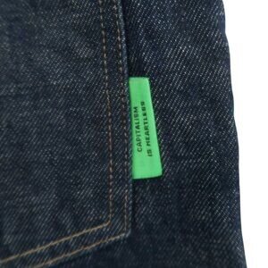 Green label at back pocket: CAPITALISM IS HEARTLESS.