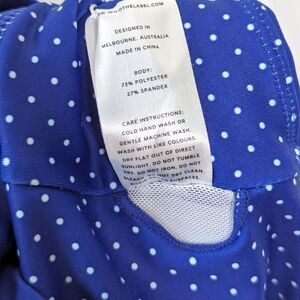 This fun polkadot print sports bra is made from a thick stretchy royal blue cobalt fabric and has slits to add your own padding. White banded trim. Wide supportive back band with fixed wide straps. Vibrant and playful. New and unworn.