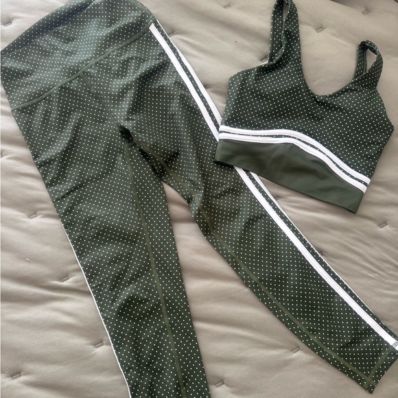 Stylish green activewear set with polka dots. Includes leggings and a sports bra. Features white stripe accents. Brand: WILO.