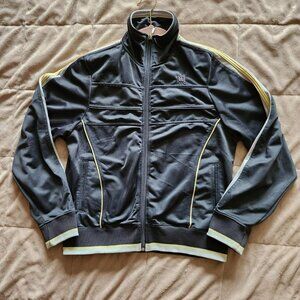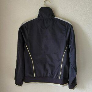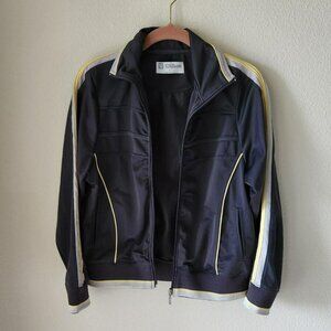 Gray tracksuit style jacket with white and yellow striped trim. Y2k, 90s, Cropped style, two side slit pockets. Super cute.