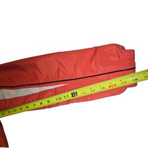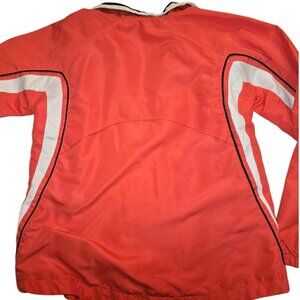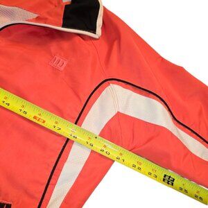 Excellent like new condition. Women's lightweight windbreaker jacket by WILSON. Long sleeves with elastic cuffs. Full zip front. Melon pink or pinkish-orange with black and white detail. Embroidered logo on front left chest.