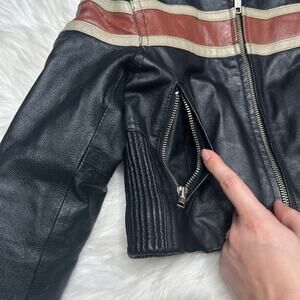 Black genuine leather jacket with orange and tan leather cafe racer stripes. Zips all the way up with YKK zipper. Zippered front pockets. Stretch panels on sides. Zippers at sleeve cuffs.