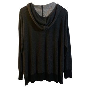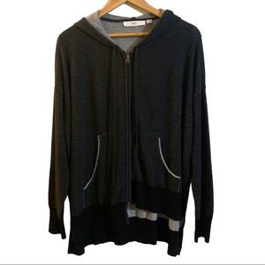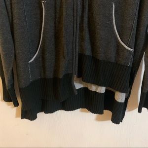 The sweatshirt jacket hoodie contains an irregular hem line and a terry cloth feel interior.