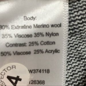 Material blend is extra fine merino wool, viscose and nylon blend.