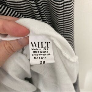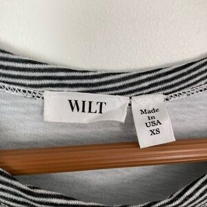 WILT Striped Asymmetric Drop Torso Tee Shirt Dress. Sold on Shopbop. Designed with a slightly off-kilter silhouette and embellished with thin stripes that create a dazzling moiré effect, this Wilt dress is about as un-basic as everyday basics get. Soft jersey. Flared, ruffled skirt. Asymmetrical hem. Stripe pattern. Scoop neck. Short sleeves. Fully lined Pit to Pit: 18in Length: 35in - 40in *measurements are approx* Condition: Pre-Loved - EUC Flaws: N/A Tags: quiet luxury, minimalist, capsule wardrobe, casual dress, t-shirt dress, shirt dress P15z4