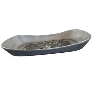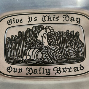 This is a pewter bread tray that says "Give us this day our daily bread" in good used condition. There is general wear but still in good condition!