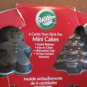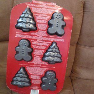 BRAND NEW MINI CAKE PAN by WILTON. This cake pan features 6 cavities, 3 CHRISTMAS TREES and 3 GINGERBREAD MEN. It has a NON-STICK surface for easy release of the mini cakes.