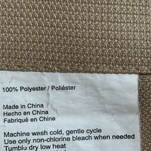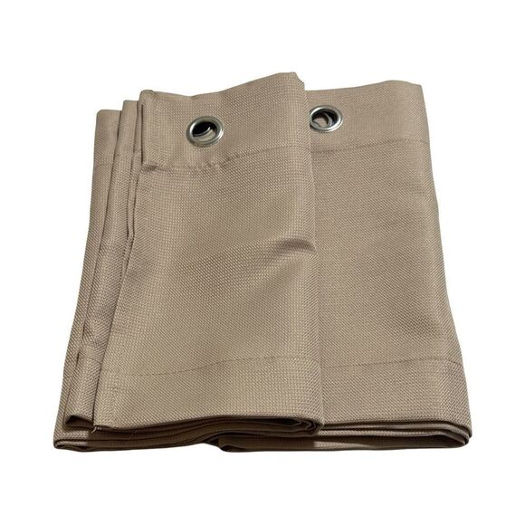 These tan textured valances feature a casual design with visible metal grommets. Made from a sturdy fabric.